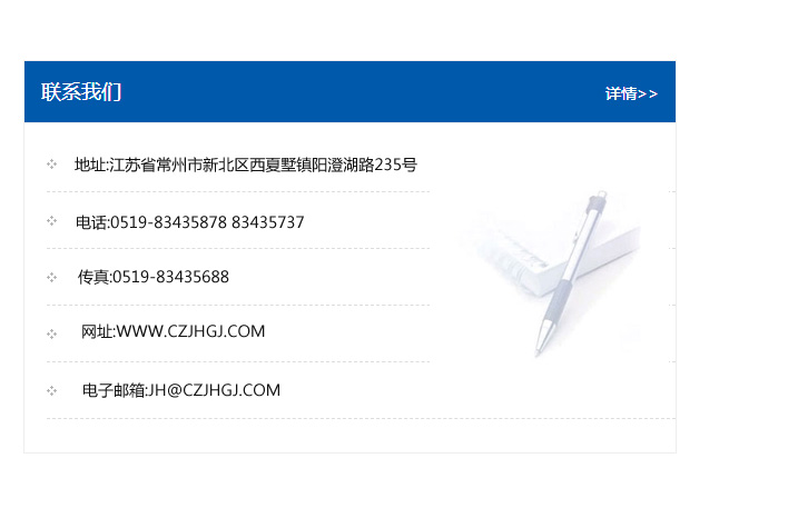 地址:常州市新北區(qū)友邦商務(wù)大廈1幢16、17層  電話:0519-85101652  傳真:0519-85112595  郵編:213022  網(wǎng)址:www_cz-jiayue_cn.weeshoo.net  郵箱:xiajifengaa@163.com